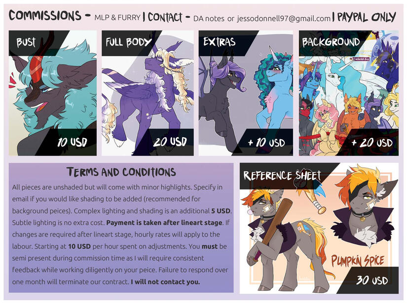 My commissions are not open usually but you may ask regardless as sometimes I will have free time. I have the right to refuse given any circumstance, health or otherwise. You can contact me using my DeviantArt for art work of original characters.I also do professional media such as logo and poster design. My professional rate is 15$ USD hourly. Email me at: [email protected]I draw the following: